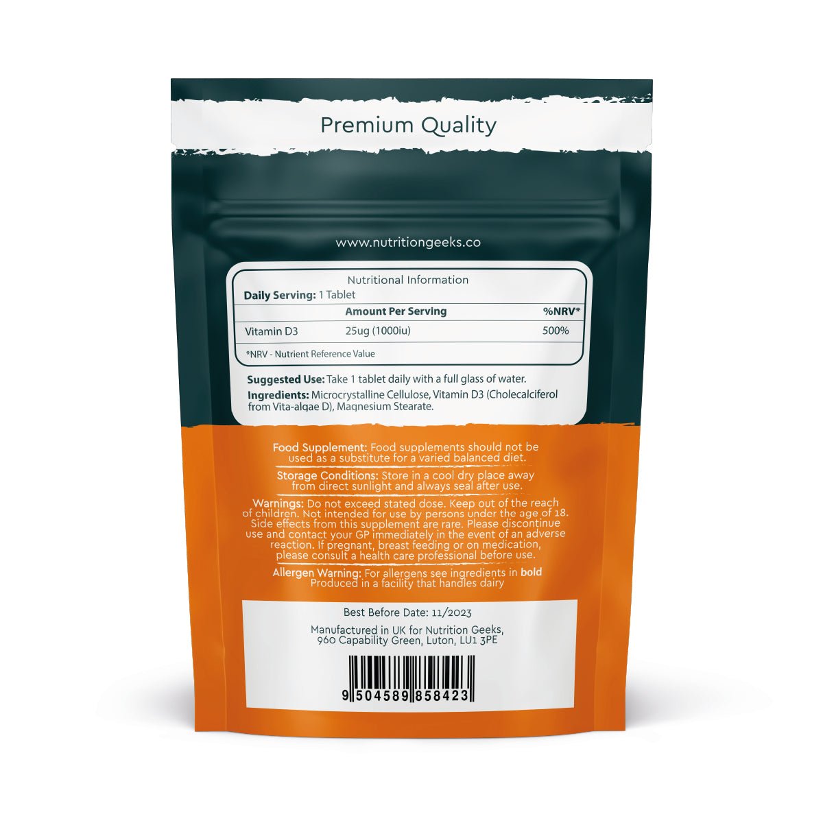 Each tablet contains 1000iu of Vitamin D3, providing 500% of your Nutrient Reference Value (NRV) for maximum health benefits.
